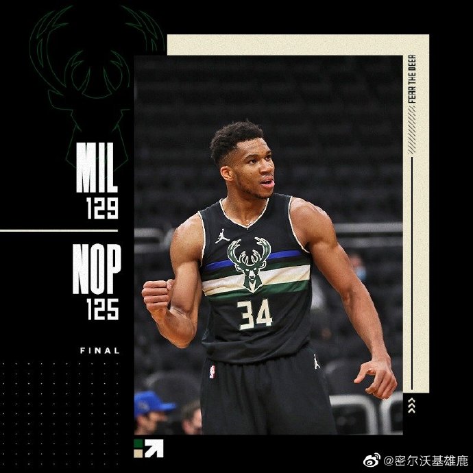 雄鹿:字母哥38分10篮板4助攻,米德尔顿31分7篮板6助攻,波蒂斯12分8篮板,迪文岑佐24分7篮板9助攻2断,大洛12分5篮板3帽,康诺顿8分