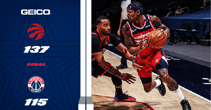 JRS低调看直播2月11日讯 NBA常规赛,奇才今日坐镇主场迎战猛龙,猛龙上场比赛第四节逆转战胜灰熊,奇才上场也险胜公牛,本场比赛威斯布鲁克回归。比赛开局阶段,猛龙全队三分手感火热连续投进,建立优势,奇才外线失准只能内线强打或找寻突破机会得分苦苦支撑,首节结束猛龙领先12分。第二节小洛佩兹成为奇兵,内线连续打成帮奇才追近比分,猛龙在西亚卡姆、洛瑞的带领下半场结束依然保持13分的领先优势。下半场,奇才追分势头迅猛,比尔、阿夫迪亚联手打出8-0小高潮,猛龙依靠三分手感依然保持双位数领先,末节纳斯关键挑战成功,鲍威尔屡屡建功,猛龙一波11-0杀死比赛,最终猛龙137-115轻取奇才,拿到连胜。