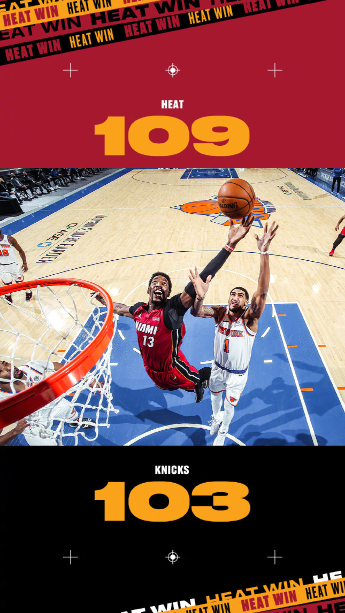JRS低调看直播2月8日讯 NBA常规赛尼克斯主场对阵热火,尼克斯近来取得2连胜,热火则是仅排在东部倒数第三。开场后布洛克就手感火热连中三分帮助尼克斯取得领先,不过热火逐渐打出气势完成反超,第二节场上局势仍旧胶着,虽然尼克斯一度掀起反扑完成反超,但是阿德巴约和巴特勒仍旧帮助热火以60-59领先1分结束上半场。下半场回来两队手感再次回落,不过热火仍旧靠着三分稍稍拉开比分,虽然尼克斯穷追不舍,不过关键时刻巴特勒和阿德巴约仍旧帮助热火锁定胜局,最终热火109-103力克尼克斯。