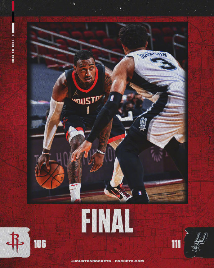 JRS低调看直播2月7日讯 NBA常规赛火箭主场对阵马刺,本场比赛阿尔德里奇和沃克都不出战,伍德也因伤缺阵。开场后马刺率先打出攻势取得领先,考辛斯和戈登接连射中三分咬住比分,第二节两队手感都比较一般,盖伊在外线三分手感不错,不过沃尔和考辛斯为火箭追分,上半场马刺51-47领先4分。下半场回来场上局势仍旧胶着,两队手感恢复不断拿分,第四节火箭一度完成反超,不过马刺最后关头顶住压力拿下比赛胜利,最终马刺111-106险胜火箭。
