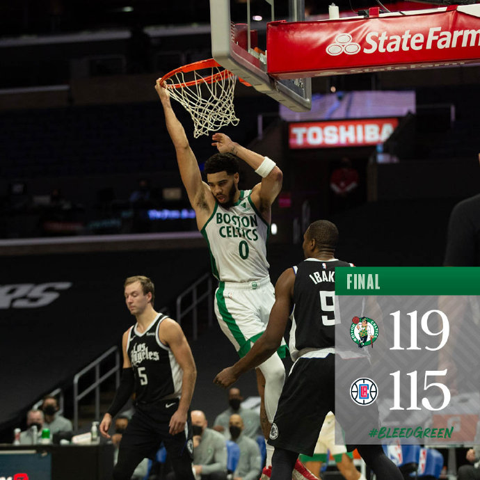 JRS低调看直播2月6日讯 快船今日坐镇主场迎来凯尔特人的挑战,乔治因右脚酸痛缺席比赛,布朗则因膝盖不适同样缺阵。首节开局肯纳德成为奇兵连续命中三分帮助快船打出15-4的开局并早早确立起领先,而这波进攻高潮也是快船在上半场一路保持领先的基础,绿军虽然之后找回进攻感觉但无法阻止对手,半场结束时快船领先绿军11分。下半场场面风云突变,绿军外线突然下起三分雨,以塔图姆为首的绿军打出一波26-6的攻势一举扭转比分,不过快船也在随后及时做出回应,路威拿下关键9分帮助快船追上比分,小卡连拿4分更是实现反超。但关键时刻小卡出现两次致命失误,绿军凭借5次罚球机会和沃克的跳投反超比分。最终,绿军客场击沉快船拿下比赛。