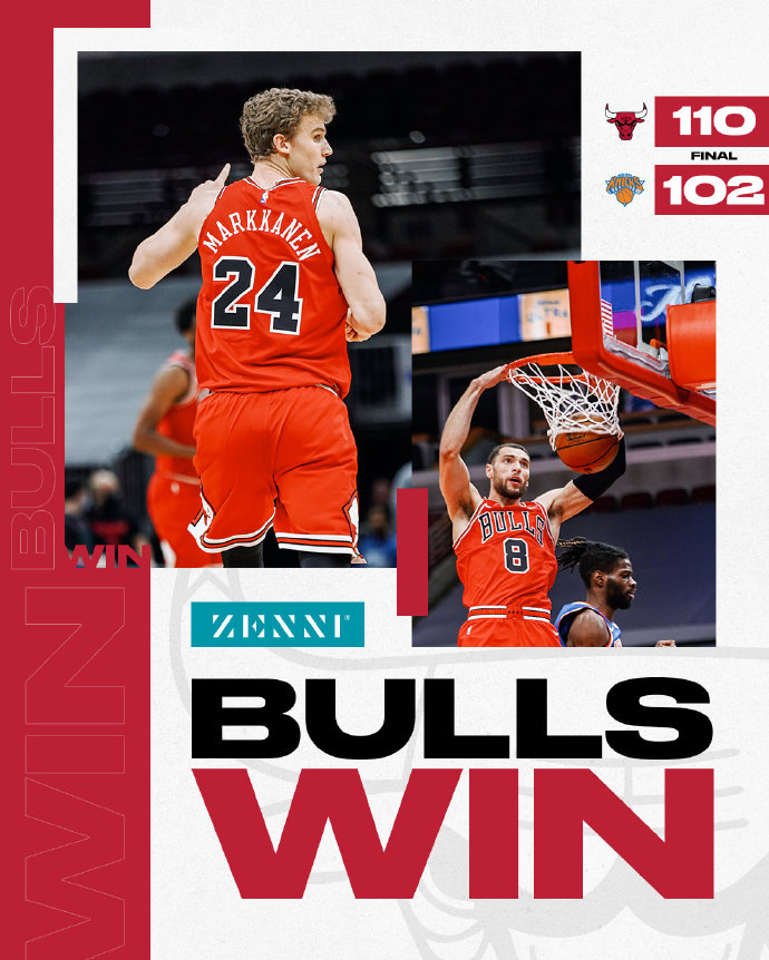 JRS低调看直播2月2日讯 公牛今日坐镇主场迎来尼克斯的挑战,两支球队近期状态都很糟糕,客队尼克斯最近5场输掉了4场,而主队公牛则遭遇3连败。首节比赛两队状态都很出色一路对攻,马尔卡宁成了搅局者,他在节中连拿12分带领公牛逐渐拉开比分,次节在尼克斯起势一度扭转比分之际,又是马尔卡宁站出来连续砍分止住颓势,他在上半场便攻下23分,而公牛也以59-55领先尼克斯结束上半场。下半场两队状态依旧僵持难以分出胜负,悬念一直保留到了最后一刻,整场发挥出色的兰德尔最后时刻出现致命失误,而公牛凭借着怀特和拉文的两记三分锁定胜局。最终,公牛主场险胜尼克斯结束3连败。