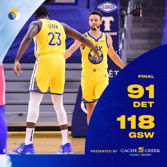 JRS低调看直播1月31日讯 勇士今日坐镇主场迎战活塞,首节比赛勇士三位核心库里、维金斯和乌布雷合力砍下23分,活塞则进攻断断续续完全找不到感觉,勇士首节便取得12分领先,次节活塞进攻端虽然有所回暖但勇士手感更热,节中勇士一波14-3的攻势一度取得23分领先,半场结束时勇士就以64-45领先活塞。下半场局面依旧,勇士每一节都占据上风不断扩大领先,第三节末段勇士就将领先扩大至30分以上早早就奠定了胜局。最终,勇士大胜活塞迎来最近4场比赛里的第3场胜利。