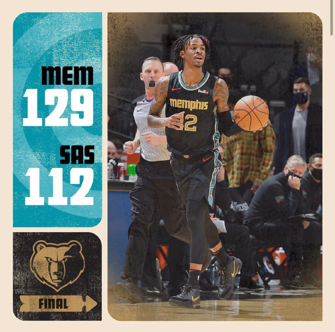 JRS低调看直播1月31日讯 NBA常规赛迎来西南区内战,近来攀升至西部第四的马刺迎战灰熊,后者在多场比赛延期后迎来近两周首战,首节一上来两队外线火热对飚,莫兰特极限拉杆打成2+1,首节结束后灰熊领先8分,次节回来后双方你来我往陷入缠斗,末段灰熊多点开花再次占据优势,半场战罢,灰熊继续领先7分。易边再战后莫兰特火力全开,本节他率队守住优势,三节结束后灰熊依然领先10分,末节决战,马刺追分乏力,最终灰熊129-112大胜马刺。