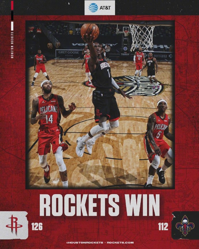JRS低调看直播1月31日讯 NBA常规赛,鹈鹕今日迎战火箭,前者两连胜后排在西部倒数第二位,而后者更是一波四连胜后来到西部第十的位置。比赛上来鹈鹕就率先进入状态取得领先,分差也是逐渐达到两位数,但进入次节火箭在进攻端突然爆发,单节爆砍48分实现反超并建立起18分的优势结束半场。易边再战,火箭始终掌握着场上的主动权,分差也是被继续扩大到二十分以上,比赛早早失去悬念,最终火箭大胜鹈鹕,迎来五连胜。