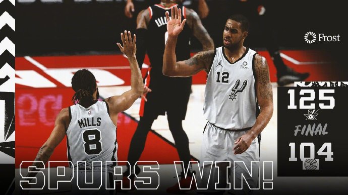 JRS低调看直播1月19日讯 NBA常规赛马刺客场挑战开拓者,麦科勒姆因伤缺阵。开场后阿尔德里奇就在中距离频频拿分,不过首发出战的胡德也是手感火热,两队多次打成平手,第二节米尔斯替补登场后手感火热,虽然开拓者也接连回敬,但马刺仍旧逐渐扩大优势。但此后开拓者掀起反扑缩小分差,上半场打完,马刺59-54领先开拓者。下半场回来阿尔德里奇再次中距离连续投进,利拉德带领开拓者一度完成反超,不过马刺依靠拼抢前场篮板稳住阵脚,第四节上来盖伊和米尔斯就连中三分拉开比分,虽然开拓者一度用三分回应,但盖伊手感火热,尽管利拉德努力追分但于事无补,最终马刺125-104轻松拿下开拓者。