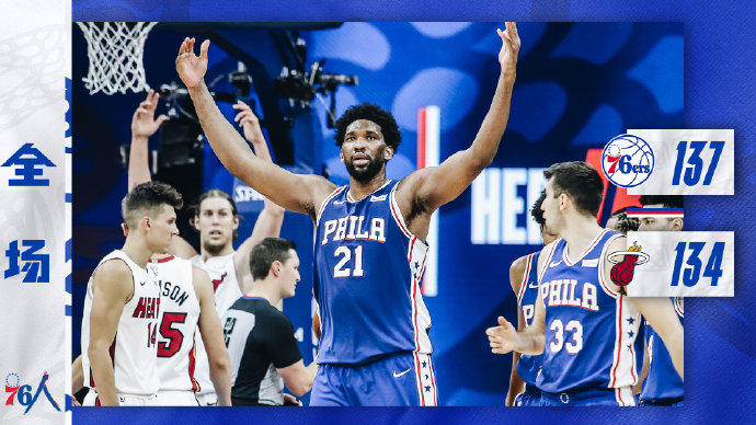 JRS低调看直播1月13日讯 76人今日坐镇主场迎战热火,76人遭遇新冠隔离问题导致人员不整,近期遭遇3连败让出了东部榜首位置,热火近期同样受新冠影响,上一场对阵凯尔特人凑不齐8人导致比赛延期。首节比赛76人依靠15-6的开局抢到领先,但后半节轮换热火回敬一波9-1的攻势迅速追上比分。次节热火外线突然爆发,这一节他们爆发命中8记三分轰下38分,半场结束时热火领先76人8分。第三节恩比德突然爆发, 他这一节4分钟里轰下18分,单节贡献20分3篮板3助攻带队实现反超,末节76人曾依靠开局格林的两记三分将优势拉大至两位数,但热火也有他们的英雄,希罗迎来爆发砍下12分,热火追平比分将悬念保留到最后。最后时刻对决热火依靠阿丘瓦连续得分反超比分,不过恩比德抗住压力命中投篮将比赛拖入加时。加时赛中恩比德状态火热包揽球队前9分,而马赛厄斯则在最后投进制胜三分。最终,76人加时惊险击败热火结束3连败。
