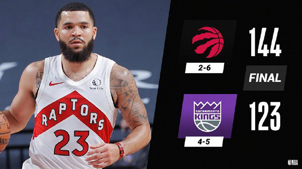 JRS低调看直播1月9日讯 国王坐镇主场迎战猛龙,此役洛瑞缺阵。首节国王手感火热,在福克斯的带领下多点开花,国王一度取得19分领先。不过,猛龙之后找到手感,在范弗里特和鲍威尔轮番得分下抹掉分差。易边再战,猛龙越投越顺,范弗里特、鲍威尔和西亚卡姆延续手感,布歇、戴维斯和弗林等一众替补亦连中三分,猛龙凭借一波三分雨直接拉开比分。最终,6人得分上双的猛龙以144-123大胜国王,止住3连败的颓势。