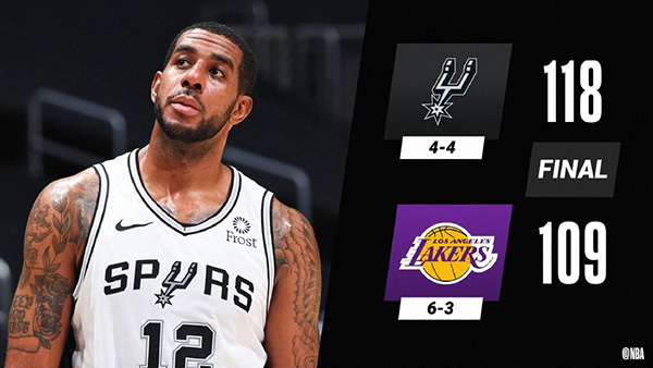 JRS低调看直播1月8日讯 湖人坐镇主场迎来马刺的挑战,马刺上一场击沉快船结束4连败,湖人则延续状态目前豪取4连胜。上半场的马刺反客为主早早进入状态,凭借着双德首节合力攻下24分,马刺抢得先机取得8分领先,次节湖人仍然阻止不了马刺的进攻,马刺半场高效率命中10记三分,球队凭借出色的内外结合保持9分领先进入下半场。第三节湖人末段发力并送出15-5的攻势抹平比分看到希望,然而他们第四节初又一次哑火,盖伊连砍8分成为关键先生,马刺送出一波11-4的攻势重新取得两位数的领先奠定胜局,最终,马刺客场击败湖人并终结对手4连胜。