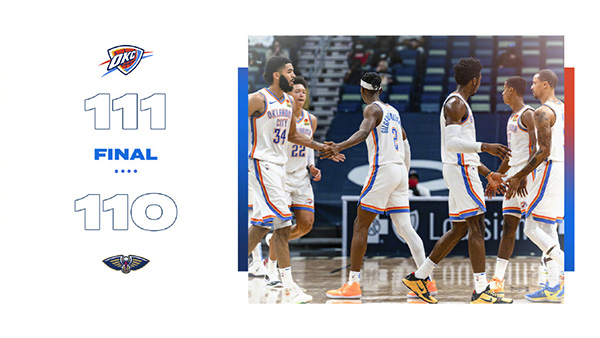 JRS低调看直播1月7日讯 NBA常规赛雷霆对阵鹈鹕,两队上场比赛都遭遇失利。开场后雷霆外线连中三分,不过锡安和亚当斯优势明显帮助鹈鹕取得领先,随后鹈鹕外线也打开局面,第二节两队先后打出攻势,上半场结束,鹈鹕59-54继续领先雷霆。下半场回来贝兹利独得11分帮助雷霆反超,虽然锡安和英格拉姆轮番为鹈鹕追分,不过亚历山大也状态神勇为雷霆保持优势,最后一节锡安和亚当斯利用内线优势帮助鹈鹕一度夺回领先,不过乔治-希尔最后造到犯规两罚全中,鹈鹕绝杀未果,最终雷霆111-110险胜鹈鹕。