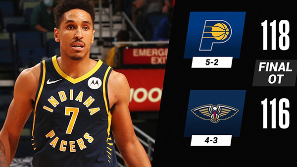JRS低调看直播1月5日讯 NBA常规赛步行者客场挑战鹈鹕,开场后依靠外线更加火热的手感鹈鹕先取得领先,不过步行者多点开花反超比分,第二节双方你来我往打得势均力敌,上半场步行者53-51领先。下半场回来锡安和亚当斯先是在内线发力,不过萨博尼斯马上强势回应,接着步行者外线开花继续保持领先,不过第四节鹈鹕发力完成反超,但他们在最后关头掉线被步行者连追10分拖入加时。加时赛中鹈鹕主要依靠英格拉姆得分,特纳和奥拉迪波帮助步行者取得领先,布罗格登完成准绝杀,鹈鹕最后一攻无果,最终步行者加时118-116力克鹈鹕。