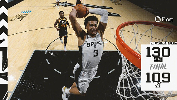 JRS低调看直播1月4日讯 NBA常规赛爵士客场对阵马刺,马刺近来状态不佳遭遇3连败。开场后爵士就早早进入状态,他们在三分线外多次命中三分取得领先,第二节克拉克森和博格达诺维奇继续带领爵士打出攻势一举将分差拉大到21分,虽然沃克和约翰逊为马刺一度缩小分差,但米切尔等人手感火热,上半场结束时爵士65-51领先马刺。下半场回来虽然马刺多次杀入内线得手,但戈贝尔也多次送出大帽,爵士外线又是多次三分雨下,第四节爵士依旧保持火热手感,马刺追分无望,最终爵士130-109送给马刺4连败。