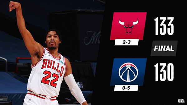 JRS低调看直播1月1日讯 奇才今日坐镇主场再战公牛,两天前两队刚刚完成一次交手,当时公牛7人得分上双击败奇才。首节比赛奇才虽然进攻端状态火热单节轰下41分,奈何防守端没能限制住公牛导致首节仅仅只取得6分领先,次节公牛迅速做出回应并迅速扭转局势,奇才在内线组合布莱恩特和八村垒半场联手攻下37分的情况下反而落后3分。下半场的奇才最多落后11分的情况下凭借末节发威扭转局势,内托成为奇兵末节独砍10分为奇才立下汗马功劳,然而最后时刻的对决,公牛合力夺回领先,随后两度封盖奇才进攻守住胜利。最终,公牛客场再胜奇才上演双杀。