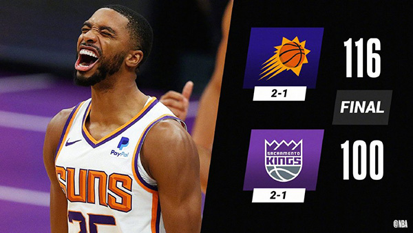 JRS低调看直播12月28日讯 NBA国王主场背靠背再战太阳,在昨天的比赛中国王3分险胜。开场后布里奇斯和艾顿发挥不错帮助太阳取得领先,但是国王通过外线打出高潮将比分反超,此后两队多次在外线命中三分,第二节两队多次打成平手,依靠布克的得分太阳在上半场以56-53领先3分。下半场回来国王率先打出攻势,布克则接连为太阳拿分,在三节结束前国王进攻断电被太阳将分差拉大到两位数,第四节国王也未能追上比分,最终太阳116-100击败国王成功复仇。