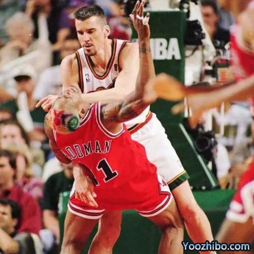 第四节中段,第一场被罗德曼搞下去的布雷考斯基再度上场。球队大比分领先,心情不错的罗德曼决定再给这个小伙子上一课。双方一来二去,你推我搡,动作越来越大。