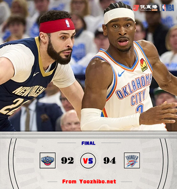 JRS低调看直播4月22日讯 西部排名第一的雷霆今日坐镇主场迎来和鹈鹕的系列赛G1之争,鹈鹕凭借附加赛击败国王的胜利搭上季后赛末班车,本场比赛锡安因伤缺阵。首节之争双方打得都比较谨慎,作为两支擅长进攻的球队但单节都只拿到17分,雷霆方面整体进攻集中在亚历山大,不过内线新人霍姆格伦发挥有些失常首节7投1中没能提供太大帮助;鹈鹕这边在第二节初依靠三记三分短暂确立起7分领先,但这些优势很快就在拉锯战中被蚕食殆尽,双方以平手形式结束上半场。休息归来雷霆在节中送出11-0的攻势拿到9分领先,虽然很快就被鹈鹕反扑抹掉,但他们很快送出第二波17-6的跨节攻势一举确立起10分领先;顽强的鹈鹕随后靠着两记三分止血,末段又连抓对手失误扭转局势。不过决胜时刻鹈鹕连着拼下三个进攻篮板都没能转化成得分,同时麦科勒姆最后的三分绝杀也没能打成,而雷霆这边亚历山大站出来连中两记高难度进球拿下5分为雷霆反超奠定胜局。最终,雷霆主场力克鹈鹕拿下开门红。