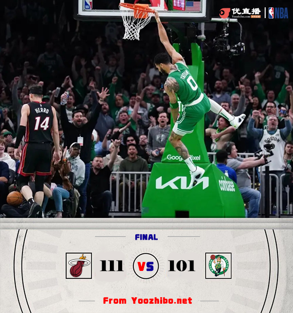 JRS低调看直播4月25日讯 NBA季后赛东部首轮G2,凯尔特人继续主场迎战热火,首场比赛凯尔特人取得20分大胜,目前1-0领先,本场比赛巴特勒继续伤缺。比赛上来,双方都迅速进入比赛状态,塔图姆状态火热,里突外投单节轰下14分,而热火则是多点开花,依靠他们并不擅长的三分球给出回应,首节热火扔进8记三分领先了1分,次节凯尔特人终于找到外线手感,一波11-4进攻波反超比分,但马丁和希罗外线也是手感火热能给出回应,双方展开对攻战,杰伦-布朗发力单节轰15分带领绿军半场反超3分。下半场,双方继续拉锯战,杰伦-布朗还保持不错状态,但马丁和希罗继续能给出回应,热火一波小高潮一度反超双位数,双探花联手追到差6分,末节赖特、海史密斯和哈克斯接连三分打破队史季后赛纪录,面对绿军追分,热火都能回应且掌握10分左右领先,最终热火111-101力克凯尔特人,大比分扳成1-1。