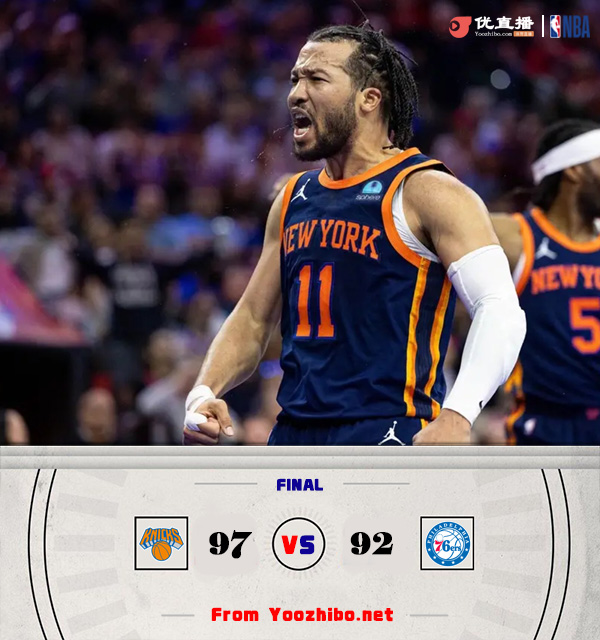 JRS低调看直播4月29日讯 NBA季后赛首轮G4,76人主场对阵尼克斯,前三场较量尼克斯大比分2-1领先。开场后两队对本场比赛都是拼尽全力,恩比德打满首节帮助76人取得领先,尼克斯这边虽然也有三名先发打满首节,但无奈除了布伦森外其他人手感冰凉。第二节趁着恩比德下场休息尼克斯掀起反扑一度将比分反超,恩比德重新登场为76人稳住阵脚。易边再战布伦森依旧保持火热的状态,他第三节独得15分帮助球队在三节过后反超1分。第四节尼克斯依靠积极的拼抢始终守住领先优势,恩比德被包夹后76人打得十分混乱。最终尼克斯97-92力克76人大比分3-1领先。