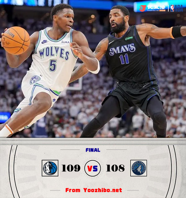 JRS低调看直播 5月25日讯 NBA西部决赛G2,森林狼主场再战独行侠。目前大比分森林狼0-1落后。比赛开始,双方开场便陷入缠斗,比分交替领先,森林狼不断冲击内线拿分,独行侠内外开花给出回应,里德手感火热连中三分,森林狼持续发力获得两位数优势,东契奇得分助攻一肩挑带队追赶,半场战罢森林狼60-48领先12分。易边再战,森林狼命中率下降,东契奇高效输出带队不断蚕食分差,末节欧文三分反超,此后双方争夺陷入白热化,关键时刻爱德华兹连投带罚拿到6分但出现关键失误,东契奇三分准绝杀,里德三分反绝杀不中,最终,独行侠109-108再胜森林狼,总比分2-0领先。