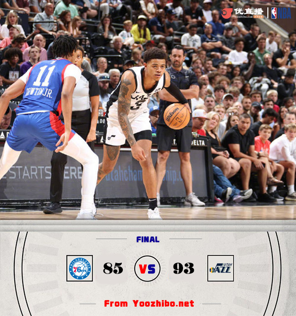 JRS低调看直播7月11日讯 NBA盐湖城夏季联赛,76人对阵爵士。一开场,双方势均力敌,比分始终紧咬,爵士内外开花,76人连投带罚打出8-0迅速回应,次节阿鲁玛三分吹响球队进攻的号角,76人持续发力扩大领先,爵士不断冲击篮筐努力追赶,康西尔飙中三分,半场战罢76人44-34领先10分。下半场,爵士大举反击,多点开花不断迫近比分,森萨博反击暴扣带队反超,末节双方争夺陷入白热化,比分交替领先,关键时刻爵士连投带罚确立优势,76人苦苦追赶无果。最终,爵士93-85力克76人。