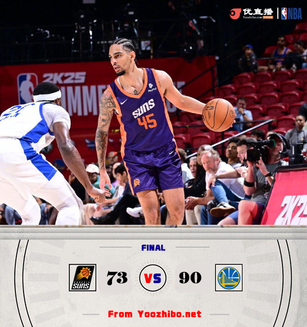 JRS低调看直播讯 7月14日 NBA夏季联赛继续开打,太阳和勇士迎来一场交手,勇士方面仍然派出波杰姆斯基和戴维斯的“老带新”阵容,太阳则是新援罗迪带队。首节勇士在和太阳短暂纠缠后迅速接管比赛,后半段几乎弹无虚发轰出21-4的攻势直接拉开两位数分差;次节勇士虽然进攻端不如首节,但他们让对手5分钟里仅得5分的防守非常成功,这一节稳定的防守帮助他们取得17分的优势进入下半场。休息归来太阳虽然进攻端稍有回暖但依旧无法阻止对手,勇士第三节首发5人里4人得分上双完全控制着比赛节奏,末节分差拉大至20分以上后比赛也彻底失去悬念。最终,勇士轻取太阳拿下比赛。
