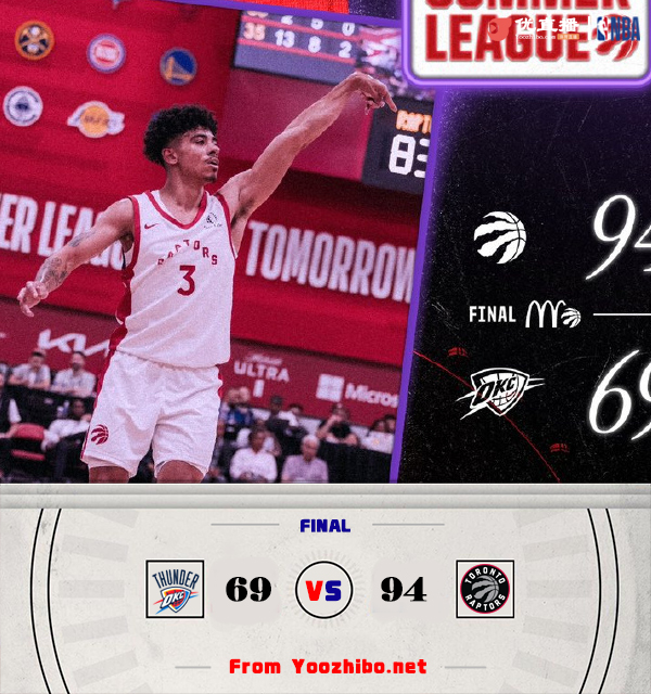 JRS低调看直播讯 7月14日讯 NBA夏季联赛,雷霆对阵猛龙。开场后猛龙打出10-1的开局,首节雷霆进攻手感不佳,猛龙单节建立起20分优势。第二节两队进攻效率都一般,猛龙没有给雷霆缩小分差的机会。易边再战,雷霆依靠弗拉格勒和琼斯的发挥将分差缩小到10分左右,迪克手感不佳频频打铁,不过第四节猛龙再次将比分拉开,最终猛龙94-69轻松击败雷霆。