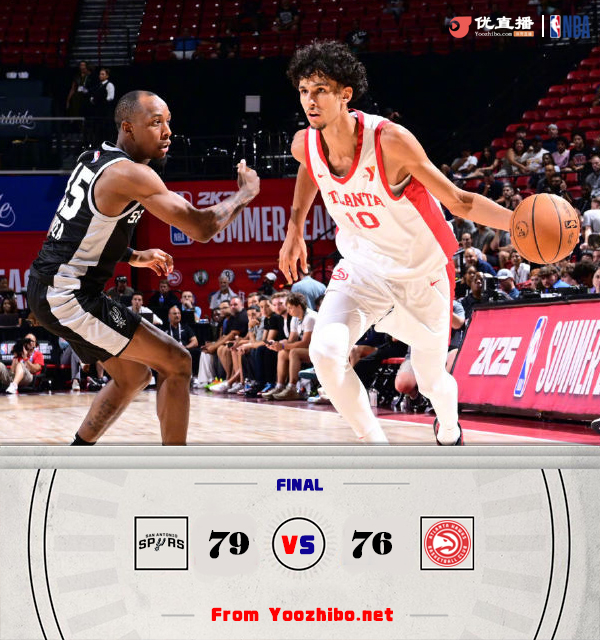 JRS低调看直播 7月15日讯 NBA夏季联赛,马刺今日对阵老鹰,前者取得两连胜,后者上场比赛则是输给了奇才,此役马刺4号秀卡斯尔缺战。比赛上来,两队短暂拉锯后马刺打出一波10-0的小高潮将分差拉开到两位数,但之后的两分钟时间里他们一分未得,老鹰连拿七分追了回来,次节双方继续保持拉锯,半场结束时马刺落后1分;下半场回来,两队依旧是打得难解难分,比赛悬念保持到了最后,关键时刻威廉姆斯利用破紧逼的机会拿到两分,随后马刺采用犯规战术不给老鹰绝平机会,最终马刺险胜老鹰,迎来三连胜。