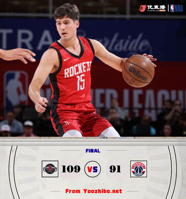 JRS低调看直播 7月14日讯 NBA夏季联赛,奇才主场迎战火箭。选秀大会上奇才主要选到榜眼萨尔、14号秀卡林顿和24号秀乔治;火箭则是选到探花谢泼德。比赛开始,火箭比较慢热被奇才打出6-1开局,谢泼德抛投终于止血,随后惠特摩尔接连冲击内线扣篮加造杀伤帮助火箭反超比分,首节火箭领先6分,次节萨尔戏份儿还是不多,外线不开和,惠特摩尔联手谢泼德接连打成反击拉开双位数领先,尚帕尼苦苦支撑,惠特摩尔又接连秀暴扣,半场火箭领先15分。下半场,谢泼德开始表演,他里突外投连砍7分,防守端也有抢断长传和切球,帮助火箭直接领先到20分以上,奇才马上回应13-2攻击波止血,末节奥兰多-罗宾逊接连内线二次篮板后打成帮助火箭重新领先到15分,随后火箭再次拉开20分以上领先,最终火箭109-91轻取奇才。