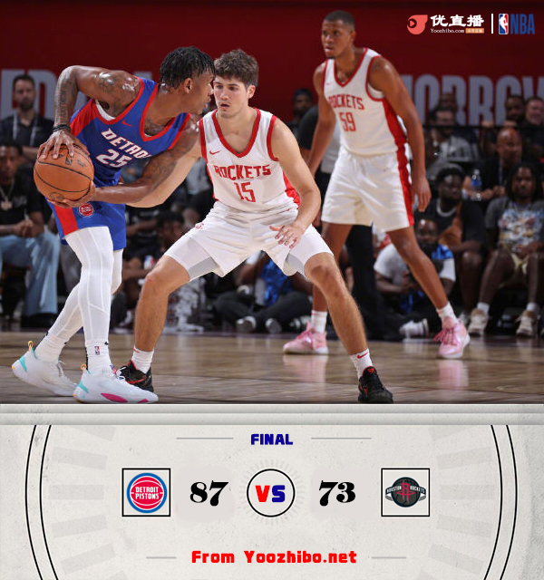 JRS低调看直播 7月16日讯 NBA夏季联赛,火箭主场对阵活塞。比赛开始,双方进攻端都比较慢热,谢泼德上篮为火箭开局,双方打了半节各自仅得6分,随后火箭抓住机会一波9-0小高潮反超比分,首节火箭领先3分,次节双方还是找不到进攻状态,惠特摩尔还是没有运动战进球,双方展开拉锯战,丹尼斯-詹金斯里突外投扛起活塞进攻,半场活塞反超1分。下半场,双方进攻端终于找回状态展开拉锯战,37号秀克林特曼接连取分,而AJ-格里芬也找到手感单节砍下9分回应,惠特摩尔终于有运动战进球,三节火箭反超1分,末节活塞上来12-0直接建立主动权,打了半节谢泼德罚篮终于破荒,随后双方又接连打铁,活塞还是能掌握住双位数领先,最终活塞87-73力克火箭。