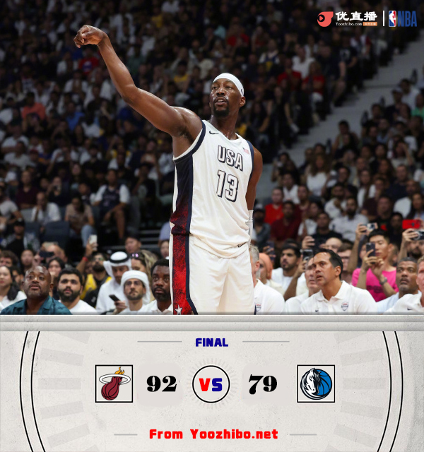 JRS低调看直播 7月18日讯  NBA夏季联赛,热火对阵独行侠。一开场,独行侠率先发力,内外开花占据主动,热火连投带罚努力追赶,次节独行侠命中率骤降,热火奋力反击轰出19-4的进攻高潮强势反超,独行侠连中两球艰难破荒,半场战罢热火37-32领先5分。下半场,双方陷入缠斗,热火始终保持微弱领先,末节独行侠将分差迫近到只剩1分,热火连中三分稳住局势,独行侠苦苦追赶无果。最终,热火92-79击败独行侠。