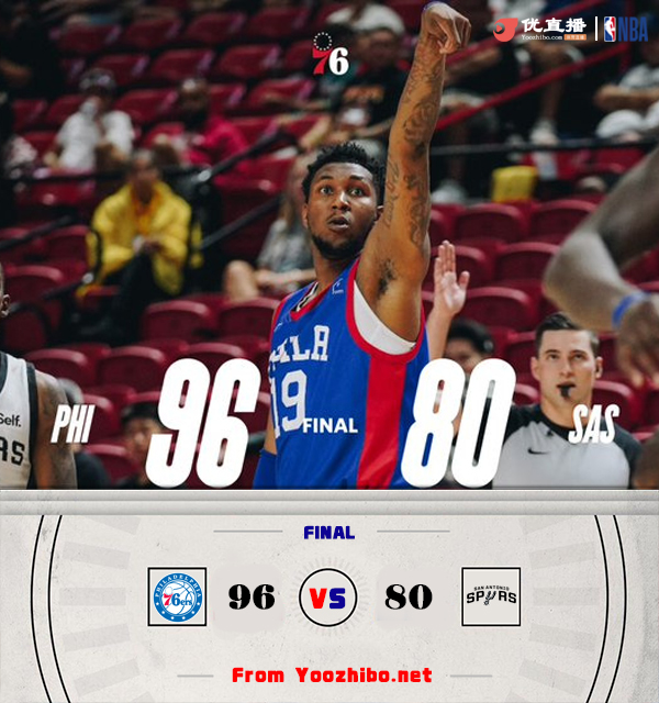 JRS低调看直播 7月20日 NBA夏季联赛,76人今日对阵马刺,前者上场比赛险胜森林狼,后者则是取得四连胜,此役卡斯尔缺战。比赛上来,76人就率先进入状态打出7-0的完美开局,整个第一节马刺的进攻都很糟糕,分差很快就拉开到了两位数,次节场上局势有所反转,76人的命中率出现下降,而马刺则是找回状态,半场结束时76人领先5分;下半场回来,马刺继续追分,三节结束分差仅剩1分,末节76人重整旗鼓再次建立起两位数的领先优势,此后也没有给马刺逆转的机会,最终76人轻取马刺,终结了后者的四连胜。