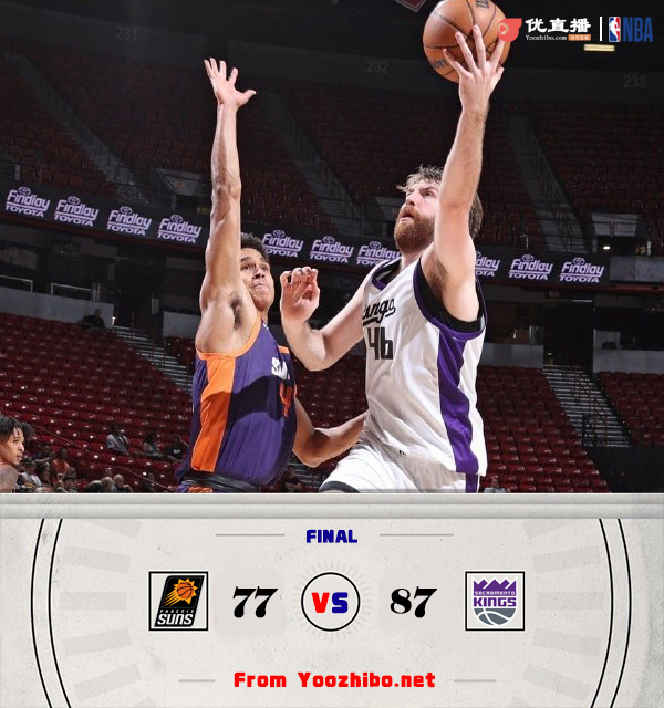 JRS低调看直播 7月21日讯 NBA夏季联赛,国王对阵太阳。比赛开始,双方势均力敌,比分咬得很紧,太阳不断冲击篮筐拿分,国王内外开花回应,次节双方继续缠斗,太阳持续发力取得微弱优势,国王里突外投迅速回应,半场战罢太阳40-38领先2分。易边再战,两队依旧打得难解难分,太阳多点开花,国王连投带罚还以颜色,末节国王持续发力打出进攻高潮将分差拉开到两位数,太阳大势已去无力回天。最终,国王87-77力克太阳。