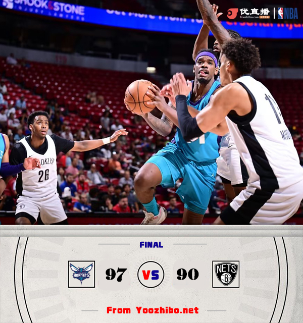 JRS低调看直播 7月22日讯 NBA夏季联赛排位赛,黄蜂对阵篮网。比赛开始,黄蜂外线连续发炮打出8-2开局,但篮网马上回应7-0小高潮,双方命中率一般,克洛尼和泰瑞斯-马丁接连三分命中助篮网首节反超2分,次节打了2分多钟黄蜂才打破僵局,双方继续展开拉锯战,斯莱特接连三分半场怒轰21分帮助黄蜂重新取得2分领先。下半场,斯莱特继续火热手感,带领黄蜂一波15-2超级进攻波重新拉开双位数领先,但篮网外线多点开花接连5记三分再次咬住比分,三节黄蜂领先6分,末节篮网接连攻击内线一度又反超1分,但黄蜂接连外线一波11-0重新掌握双位数领先,最终黄蜂97-90力克篮网。