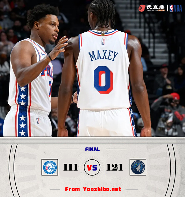 JRS低调看直播10月12日讯 NBA季前赛,森林狼对阵76人。76人新援乔治迎来首秀,恩比德缺阵。比赛开始,森林狼率先发力取得领先,76人内外开花努力追赶,次节76人进攻断电,森林狼一波15-4一度获得20分的优势,乔治独中3记三分艰难止血,半场战罢森林狼70-53领先76人。易边再战,马克西和乔治联手带队缩小分差,76人一度将比分迫近到只剩3分,此后双方均使用轮换阵容,末节双方陷入缠斗,比分咬得很紧,关键时刻森林狼连续拿分锁定胜局。最终,76人111-121不敌森林狼。