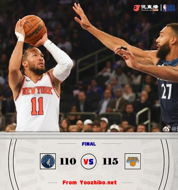 JRS低调看直播10月14日讯 NBA季前赛,尼克斯主场迎战森林狼,本场比赛兰德尔缺战,无缘对阵老东家。比赛开始,迪文岑佐接连2记三分轰下9分,阿努诺比也能连砍10分强势回应,随后双方接连打铁乱战,唐斯联手布伦森助尼克斯首节领先5分,次节双方命中率依然不高,爱德华兹接连4记三分帮助森林狼一波进攻高潮反超并领先到双位数,但尼克斯外线多点开花也能回应在半场追到差2分。下半场,爱德华兹又是连续三分带队8-0重新拉开比分,随后布伦森带队接连攻内线再次止血,双方继续胶着拉锯战,唐斯有攻有传帮助尼克斯三节反超5分,末节双方换上替补练兵,佩恩接连取分帮助尼克斯扩大领先,随后双方继续深度轮换,尼克斯保持住领先优势,最终尼克斯115-110力克森林狼。