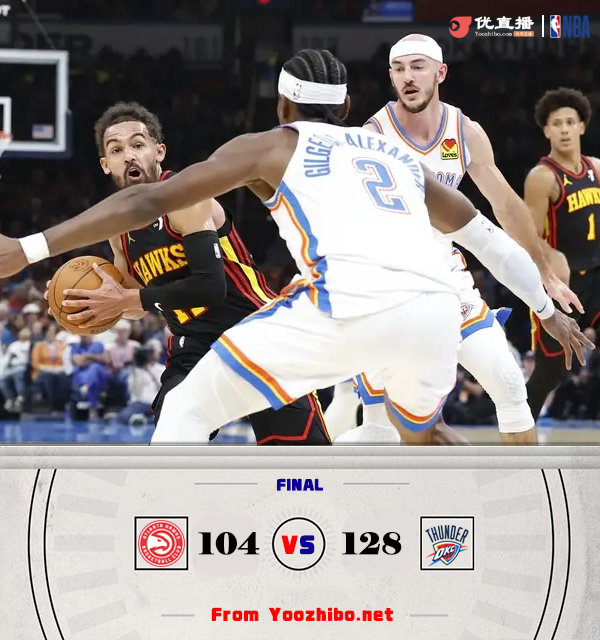 JRS低调看直播10月28日讯 NBA常规赛,老鹰对阵雷霆,两支球队新赛季开始都是取得2连胜。开场后老鹰外线手感不错连中三分,雷霆也是多点开花连连得手,场上比分也是十分胶着,里萨谢篮下表现活跃连续打进,老鹰首节保持微弱优势。第二节上来亚历山大接连砍分,老鹰外线保持不错及时回应,特雷-杨也开启得分模式帮老鹰将分差一度拉大到10分,半场结束前霍姆格伦和杰伦-威廉姆斯联手帮雷霆将分差追到只差1分。易边再战,亚历山大和霍姆格伦联手帮助雷霆完成反超,老鹰依旧是靠着三分紧追不舍。最后一节老鹰命中率下降,雷霆则是在“新三少”的带领下将分差拉大到20分,比赛失去悬念,最终雷霆128-104击败老鹰取得3连胜,老鹰遭遇赛季首败。