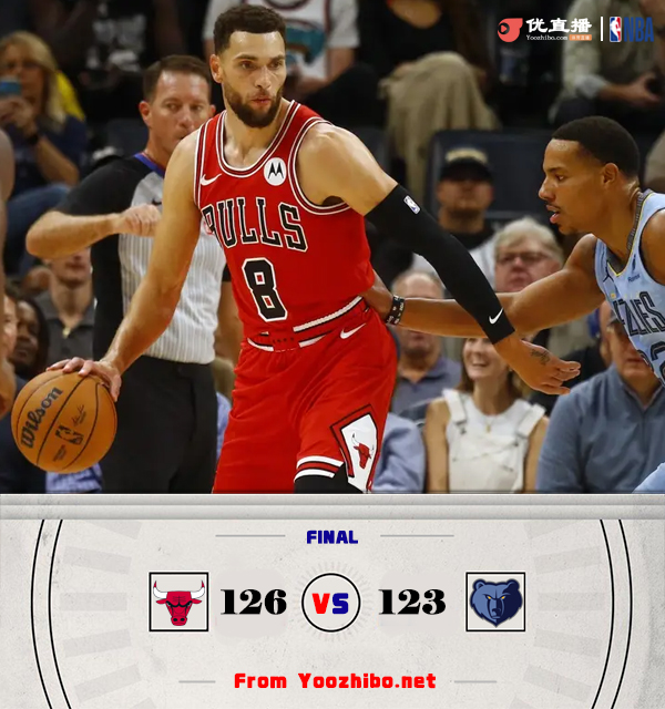 JRS低调看直播10月29日讯 NBA常规赛,灰熊主场迎战公牛。上半场,灰熊率先发力,多点开花很快取得两位数领先,次节双方大打对攻,公牛内外开花连续拿分,灰熊不断冲 击篮迅速回应,半场战罢灰熊68-54领先公牛。下半场,双方依旧火力很猛,公牛外线发力连中三分不断缩小分差,末节灰熊命中率下降,公牛持续输出反超比分,灰熊苦苦追赶无果。最终,公牛126-123力克灰熊。