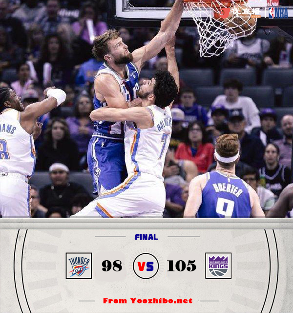 JRS低调看直播11月11日讯 NBA常规赛西部季中锦标赛C组,国王主场对阵雷霆。比赛开始,许尔特手感火热,单节砍下15分帮助国王取得两位数优势,雷霆外线手感不佳,只能不断冲击篮筐拿分缩小分差,次节国王命中率下降,雷霆趁势继续迫近比分,半场战罢雷霆42-53落后。易边再战,雷霆持续发力完成16-4的攻击波将分差缩小到只剩2分,基根-穆雷连得6分稳住局势,末节双方围绕10分左右分差展开激烈争夺,最后时刻雷霆连续打铁失误葬送希望。最终,雷霆98-105客场不敌国王。