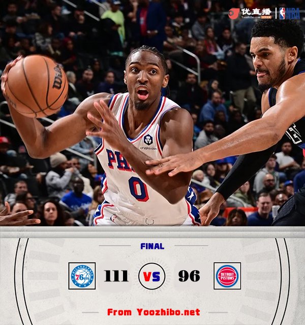 JRS低调看直播讯北京时间12月1日讯 NBA常规赛,活塞主场76人,活塞目前9胜12负排名东部第10位,76人则是2连败后3胜14负,排在东部第14位。本场比赛,乔治复出,恩比德继续缺阵。比赛开始,乔治接连助攻队友得分,但庄神抢篮板崴脚受伤,随后76人连续3记三分一波11-0直接建立主动权,76人替补也发力,首节便领先17分,次节76人进攻端有些停滞,艾维有攻有传带队追分,随后比斯利接连3记三分命中,活塞顺势追至个位数分差,半场活塞仅落后5分。下半场,马克西突然发力,里突外投连砍12分,同时还能串联,76人迅速拉开20分以上领先,活塞进攻端迟迟找不到状态,末节活塞基本上换上替补练兵,马克西带领76人牢牢保持住20分左右领先,最终76人111-96轻取活塞。