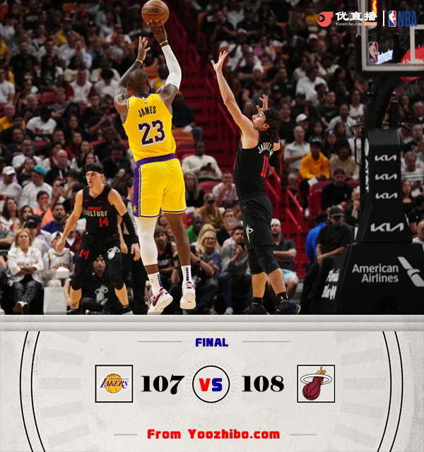 JRS低调看直播11月7日讯 NBA常规赛,热火主场迎战湖人,热火本赛季开赛状态一般,目前2胜4负,而湖人则是由于伤病等原因拿到3胜3负的战绩。比赛开始,双方外线手感都不错展开对飚,阿德巴约成为热火主力得分点,而湖人得分点更多,连续反击逐渐取得领先,但热火以邓罗为首的替补接连发挥能给出回应,首节双方打平。次节詹姆斯接连杀篮下撑起球队进攻,双方展开拉锯战,热火全民皆兵建立领先,里夫斯也能送出补扣回应,半场热火领先3分。下半场,双方继续展开拉锯战,比分持续胶着,阿德巴约有攻有传联手巴特勒一波10-0建立主动权,三节结束热火领先11分,末节詹姆斯再送暴扣,湖人7-2迅速缩近比分,但哈克斯接连篮下打成再次稳住局势,拉塞尔抱怨裁判连续吃T直接被驱逐,伍德里突外投止血,但热火还是依靠硬解给出回应重新领先到双位数,伍德三分加詹姆斯强打2+1再次咬到1分,雷迪什关键三分不进,最终湖人惜败热火。