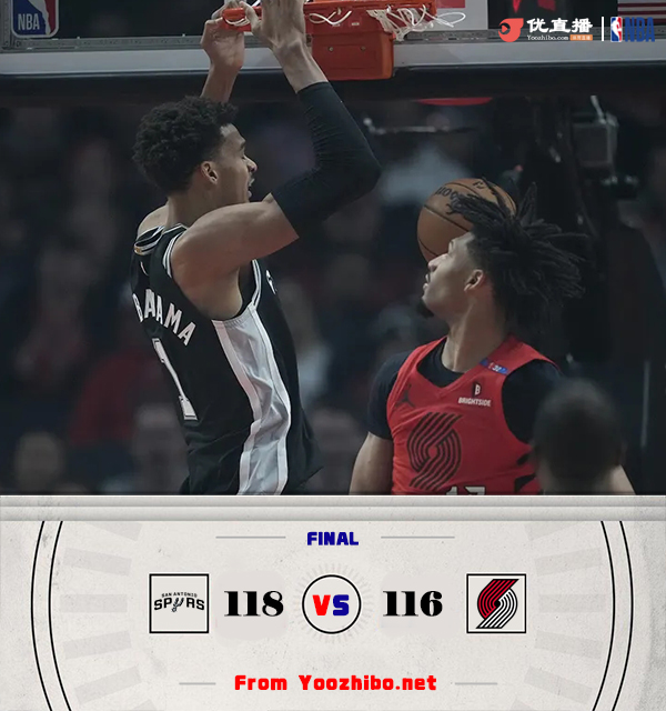 JRS低调看直播讯北京时间12月14日讯 NBA常规赛,开拓者主场迎战马刺,开拓者4连败后8胜16负排在西部第13位,马刺则是12胜12负排名西部第11,本场比赛艾顿和罗威都缺阵。比赛开始,开拓者上来打出12-5开局,随后开拓者突然断电,文班亚马攻防建功带队轰出17-3攻击波一举反超比分,保罗接连抱怨裁判连吃2T被驱逐,首节马刺领先8分,次节双方命中率都有下降,场上连续打铁,打了半节多都未得分上双,文班上场再次连续得分带队半场领先10分。下半场,格兰特连续3记三分一度助开拓者抹平分差,随后格兰特继续发力再扔进3记三分,单节轰下22分带队轰出46分直接反超8分,末节马刺连续失误,西蒙斯连续扔进三分带领开拓者一度领先到17分,但尚帕尼接连三分,马刺全民皆兵强势回应24-4进攻波反超比分,比赛进入白热化,文班亚马被格兰特犯规两罚领先,阿夫迪亚绝杀三分不中,最终马刺118-116险胜开拓者,送对手5连败。