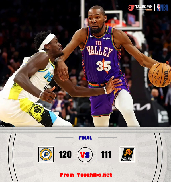 JRS低调看直播讯  北京时间12月20日讯 NBA常规赛,太阳今日迎战步行者,两队近来状态都可以,均是取得两连胜,此役比尔可以出战,内史密斯缺战。比赛上来,太阳率先进入状态取得领先,但随后他们陷入到近四分钟的得分荒,步行者趁势轰出一波14-0的攻势完成反超,之后的比赛太阳虽然一直紧咬比分却始终无法重夺领先,半场结束时步行者仍领先1分;下半场回来,步行者重新找到节奏,进攻端势如破竹单节再轰37分,分差也是拉开到了十分以上,对于太阳更为不利的是布克因腹股沟伤势提前退赛,末节步行者也没有再给对手任何机会,即便是杜兰特连续砍分也无济于事,最终步行者轻取太阳,迎来三连胜的同时也终结了后者的连胜。