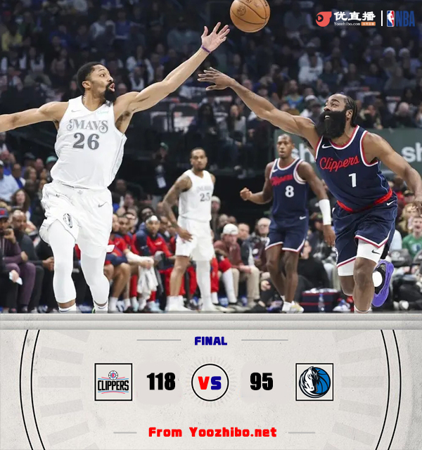 JRS低调看直播讯 北京时间12月20日讯 NBA常规赛,快船客场挑战独行侠。快船15胜12负排西部第9,独行侠17胜9负暂列西部第4。比赛开始,双方开场势均力敌,比分始终紧咬,独行侠内外开花取得8分优势,诺曼-鲍威尔连中三分独得8分带队顽强咬住,哈登和小德里克-琼斯相继命中三分,半场战罢快船50-49领先独行侠。易边再战,邓恩二级恶意犯规被直接驱逐,但快船持续发力将分差拉开到两位数,末节双方围绕10分分差展开拉锯战,快船连中三分扩大将分差拉开到20分以上,独行侠大势已去无力回天。最终,快船118-95击败独行侠,客场过关。