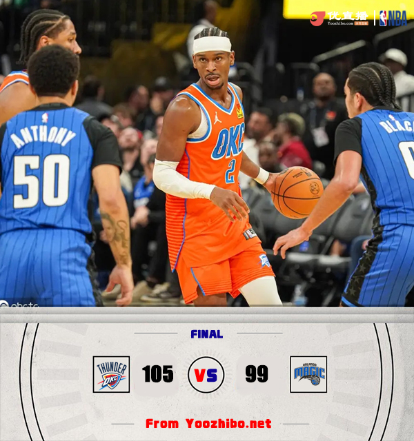 JRS低调看直播讯 北京时间12月20日讯 NBA常规赛,雷霆客场挑战魔术。雷霆刚刚不敌雄鹿无缘NBA杯冠军,但他们仍以20胜5负高居西部第一,魔术2连败,17胜11负排在东部第四。上半场,双方开场势均力敌,比分交替领先,亚历山大稳定输出,魔术多点开花予以回应,次节卡鲁索攻防两端立功带队取得两位数优势,萨格斯出现崴脚受伤,雷霆持续发力扩大优势,半场战罢雷霆65-46领先魔术。下半场,魔术奋力反击轰出22-3的进攻狂潮,末节雷霆不断冲击内线频频得手稳住局势,魔术苦苦追赶无果。最终,雷霆105-99客场击败魔术,迎来常规赛的6连胜。