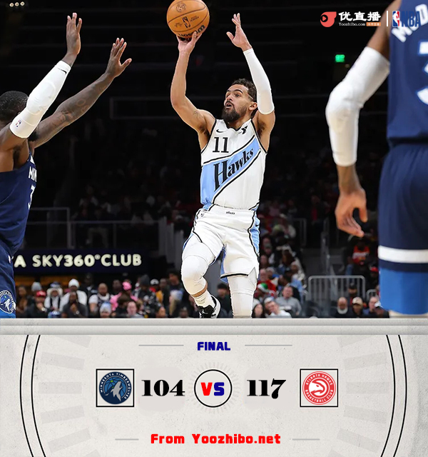 JRS低调看直播讯北京时间12月24日讯 NBA常规赛,森林狼对阵老鹰,两队最近表现都不理想,森林狼遭遇2连败,老鹰遭遇3连败。上半场两队各打一节好球,首节特雷-杨展现火热手感连连拿分,老鹰外线下起三分雨,首节便领先16分。但第二节,森林狼的轮换阵容在里德和迪文岑佐的带领下也是火力全开,老鹰则进攻准心不再,里德一度崴脚离场,森林狼单节净胜19分将比分反超。下半场回来两队陷入僵持,丹尼尔斯防守端表现给力多次贡献抢断,但森林狼进攻也打得火热。最后一节森林狼准信再度丢失,老鹰在特雷-杨的带领下趁势将比分拉开,最终老鹰117-104击败森林狼结束3连败,森林狼遭遇3连败。