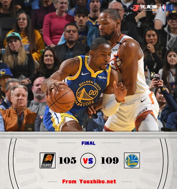 JRS低调看直播讯北京时间12月29日讯 NBA常规赛,勇士主场迎战太阳。勇士3连败目前仅排在西部第十一,太阳西部第十。布克缺阵,库里和追梦迎来复出。比赛开始,比尔手感火热4投全中独得10分,库里和库明加联手带队高效拿分强势反超,杜兰特连续强解拿分,次节勇士连续失误,太阳利用防守反击轰出26-7的进攻狂潮取得两位数领先,追梦连中三分止血,库里压哨命中,半场战罢太阳65-61领先勇士。易边再战,勇士一波7-0的夺回优势,此后双方陷入缠斗,比分交替领先,太阳持续发力占据主动,末节勇士打出10-1反超比分,双方争夺陷入白热化,关键时刻杜兰特和库明加各自两罚全中,太阳连续打铁,勇士罚球杀死比赛。最终,勇士109-105力克太阳,结束了自己的3连败。