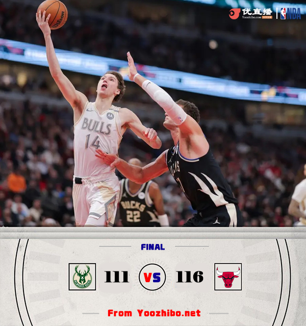 JRS低调看直播讯北京时间12月29日讯 NBA常规赛激战正酣,公牛和雄鹿两支东部球队直接对话,此前因小腿伤势和非新冠疾病缺席4场的利拉德此役复出,字母哥因生病继续缺阵。此役一上来公牛外线率先开张,雄鹿开局状态慢热,米德尔顿和波蒂斯短暂止血,公牛多点开花确立优势,首节结束时公牛领先8分,次节回来,雄鹿逐渐找到进攻感觉,利拉德连投带罚不断杀伤,大洛联手米德尔顿外线续上火力,雄鹿稳扎稳打缩小分差,半场战罢,雄鹿仅落后2分。易边再战后两队进攻火力放缓,利拉德连投带罚串联全队,公牛找回状态及时回应,双方你来我往比分紧咬,三节结束后雄鹿反超1分,末节决战,基迪突然发力连续取分,公牛迅速夺回优势,决胜时刻雄鹿连续不中,公牛连中罚球锁定胜局,最终公牛116-111力克对手终结3连败。