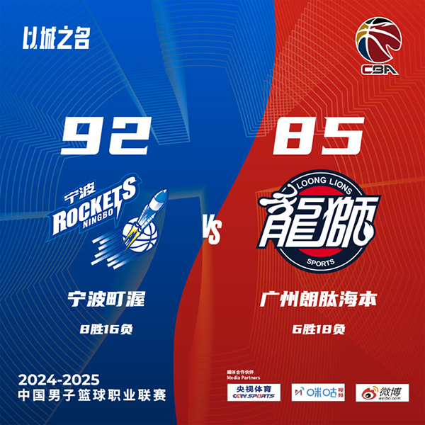 JRS低调看直播讯北京时间12月30日讯 CBA常规赛,宁波今日迎战广州,前者上场比赛不敌青岛,后者更是状态糟糕已经七连败。比赛上来,广州率先拿到两分后宁波连拿六分取得领先,分差也是拉开到两位数,整个第一节广州的进攻都不好只拿到16分,次节广州的表现依旧没有好转,场上分差不减反增,半场结束时宁波领先14分;下半场回来,两队的命中率仍然很低,不过宁波始终占据着场上的主动权,广州无法获得迫近比分的机会,末节广州一度将分差追到个位数但终究无法实现逆转,最终宁波轻取广州,送给后者八连败。