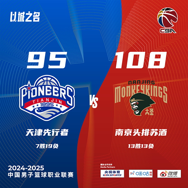 双方比分及数据: 单节比分:30-25、31-20、30-10、17-40(同曦在前)。 天津(7-19):詹姆斯34分22篮板6助攻,拉维特16分3篮板2助攻,时德帅14分8篮板,张云梦5分4篮板,林庭谦10分6助攻3篮板,哈姆雷特8分,王一方5分3助攻。