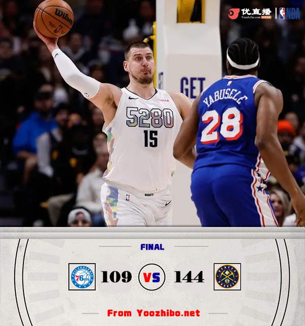 JRS低调看直播讯 北京时间1月22日讯 NBA常规赛,掘金主场迎战76人。掘金26胜16负稳居西部第四,76人15胜26负排东部第十一,近期更是遭遇6连败。恩比德继续缺阵。一开场,双方短暂相持,随后掘金内外开花一举取得两位数优势,乔治三分止血,次节双方围绕10分左右分差展开拉锯战,掘金连中三分,马克西内外开花顽强咬住,半场战罢掘金77-67领先76人。下半场,掘金延续火力,多点开花将优势扩大到20分以上,末节掘金稳扎稳打,76人大势已去无力回天。最终,掘金144-109大胜76人,送给对手7连败。